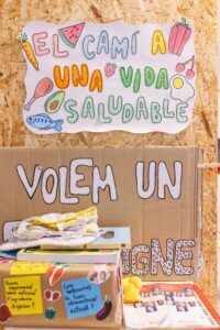 - Plantegem un canvi de model alimentari a la residència maternal. Eliminem la compra de productes ultraprocesats que no son saludables i que tenen una petjada ecològica molt gran i els substituïm per aliments frescos i de km0. Es deixen de comprar galetes, brioixeria industrial, crema de cacao industrial , snaks industrials, verdures congelades , aigua envasada etc. Tampoc s’accepten donacions externes d’aquests tipus de productes En el seu lloc es fa comanda de fruites i verdures fresques a una fruiteria del barri cada setmana Es fa comanda de fruits secs, fruita deshidratada i cremes naturals de fruits secs a una botiga a granel del barri Es recull donació de pa de qualitat del forn Baluard Es treballa amb les residents l’adquisició de nous hàbits alimentaris aprenent receptes noves Es reparteix entre les residents envoltoris reutilitzables per a begudes i snaks.