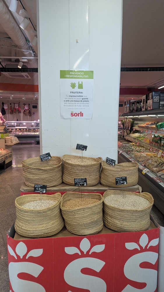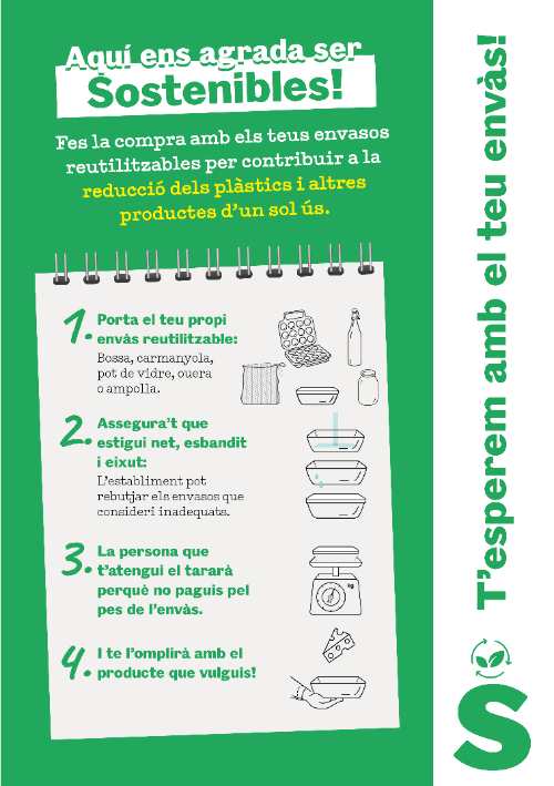 - Promovem la reducció de plàstics i envasos d’un sol ús facilitant que els clients puguin portar els seus propis envasos reutilitzables. A més, duem a terme una acció pedagògica amb els clients, sensibilitzant-los sobre la importància de reduir residus i exposant cartells que conviden a portar els seus envasos. Aquesta pràctica no només minimitza els residus, sinó que reforça el compromís del sector amb el medi ambient i el consum responsable. A més a més, oferim de diversos envasos reutilitzables com bosses de malla o bosses de ràfia. Quan l’ús d’envasos reutilitzables no sigui possible, apostem per envasos biodegradables elaborats amb materials procedents de fonts renovables. Aquest canvi contribueix directament a la reducció de la contaminació, la preservació de la biodiversitat i la disminució de l’efecte hivernacle. L’adopció d’aquestes mesures també reforça la imatge de qualitat i compromís dels nostres establiments, atorgant més prestigi i confiança als productes que oferim als consumidors que sempre intentem que siguin de proximitat, si és possible.
