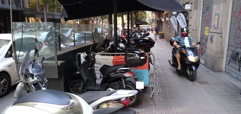 Les voreres de l´Eixample segueixen plenes de motos aparcades de forma il·legal. La gran majoria en semi-bateria, ocupant entre un 30 i 50% de la vorera. Per davant d´escocells, a menys de 2m de pas de vianants i moltes accedint a la vorera amb el motor en marxa.