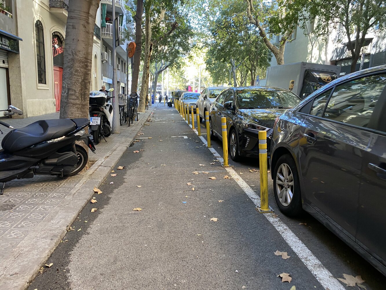 Al carrer més petit de l'Eixample hi tenim cotxes aparcats als dos costats, cotxes circulant a 30 km/h i un carril inutilitzat des de fa anys sense cap ús separat amb pivots. Tot això en asfalt i el vianant només té unes petites voreres.