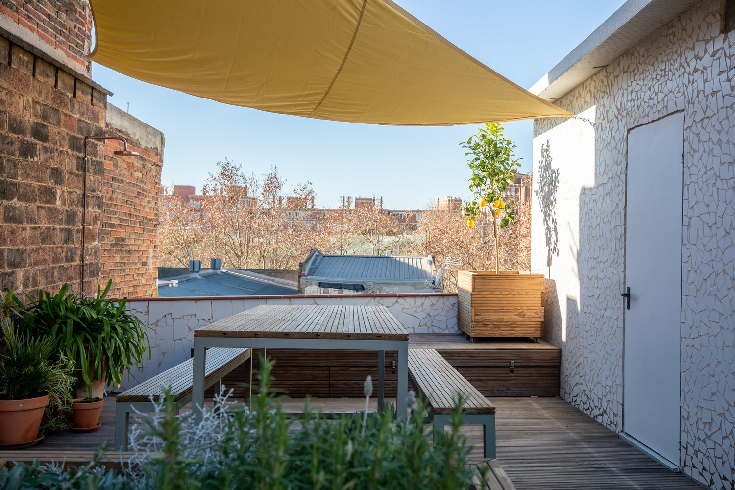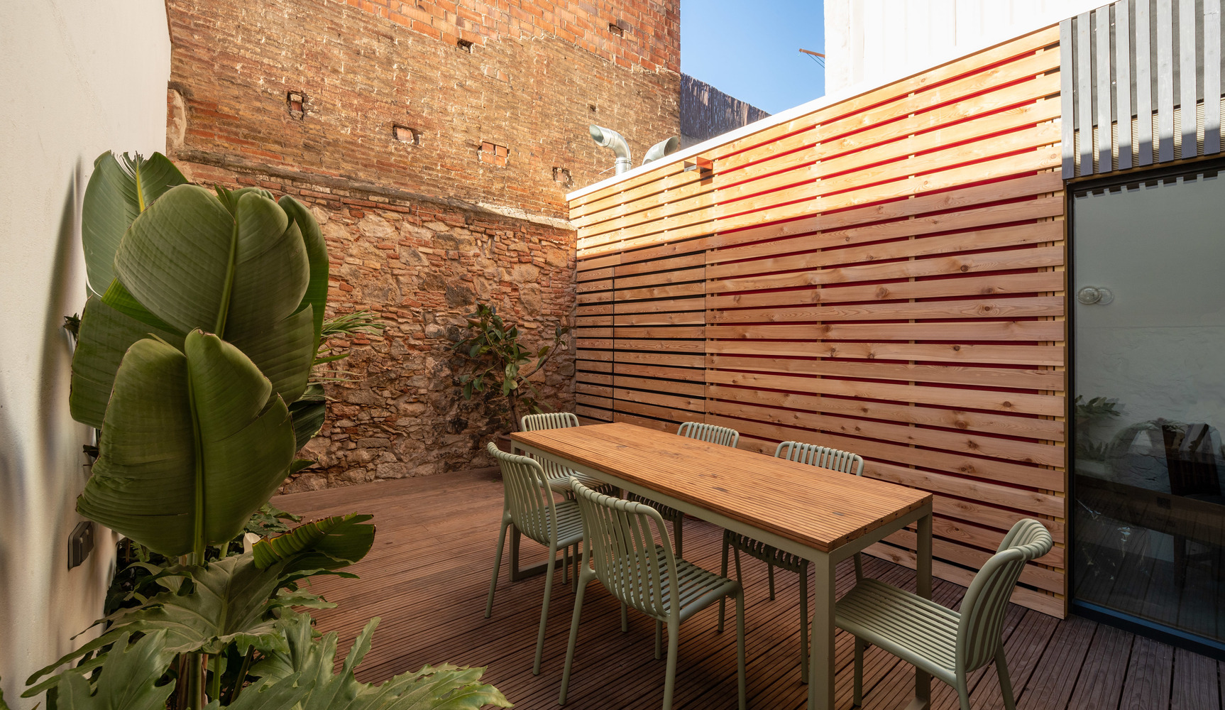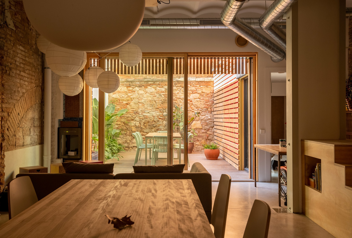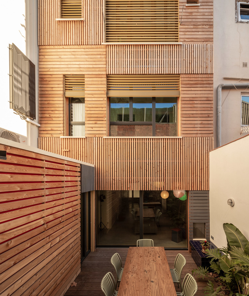 La definició arquitectònica del nou habitatge entre mitgeres assumeix les preexistències, tant per a realçar el valor identitari de l'edifici com per a resoldre les mancances energètiques i funcionals que presenta aquesta tipologia. Per això, el programa en planta baixa es distribueix en 2 franges: una àmplia i oberta, amb llum natural i possibilitat de ventilació creuada, per als usos comuns, i una altra estreta i compacta on se situen les comunicacions verticals, serveis i quarts tècnics. Es facilita així la distribució de les plantes superiors, els espais comuns de les quals també gaudeixen del contacte amb l'exterior i la llum natural.