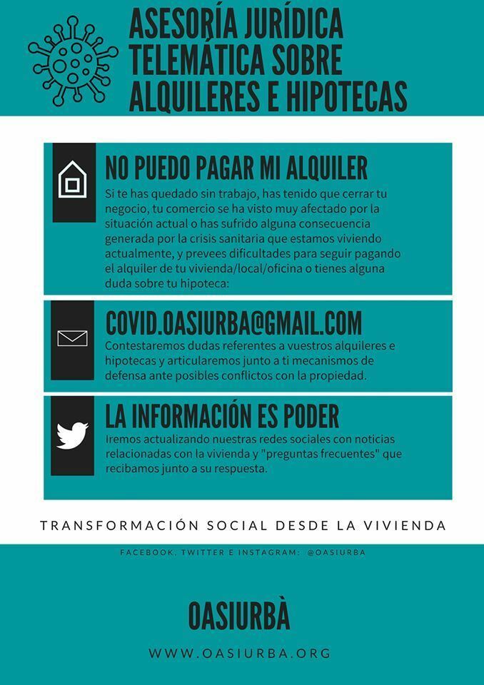 Entitat del Raval que ofereix servei d'assessoria jurídica telemàtica totalment gatuïta sobre lloguers, hipoteques i locals comercials. https://www.facebook.com/oasiurba/photos/a.2224435277800333/2630574163853107/?type=3