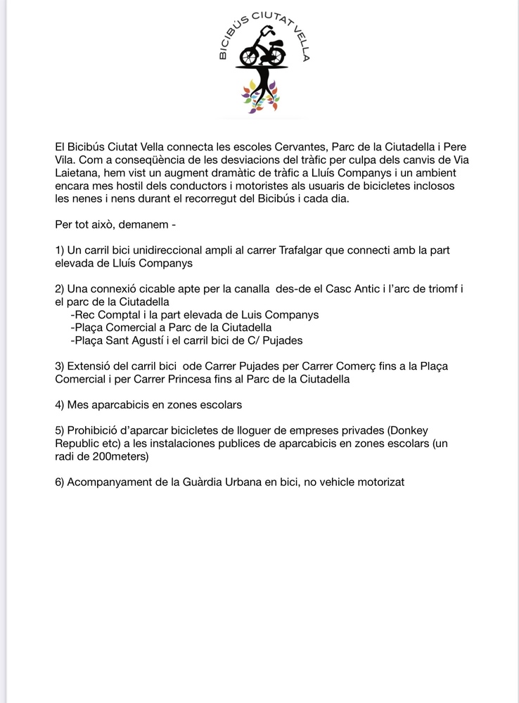 El Bicibús Ciutat Vella existeix des-de el principi del Març 2022 i porta una mitjana de 40 persones a les escoles Cervantes, Parc de la Ciutadella i Pere Vila cada divendres en una manera saludable i sostenible. Encara aixi, patim una hostilitat brutal des-de els usuaris de vehicles motorizats i per aixo aqui hi ha les nostres propostes per millorar la xarxa ciclista del barri i convertir el Casc Antic a una zona cicable i segur pels infants en bicicleta