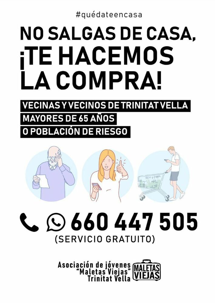 L'associació de la Trinitat Vella Maletas Viejas ha fet una crida a les persones grans o vulnerables del barri per evitar que surtin de casa i fer-se càrrec de les seves comandes de la compra. Si ets un grup de risc, de més de 65 anys o ets immunodeprimit o immunodeprimida, pots contactar a través del whatsapp 660447505 i demanar allò que necessitis per no sortir del carrer.
