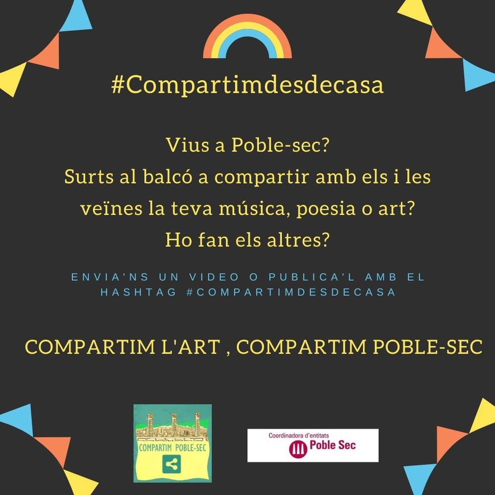 Des del Compartim Poble-sec, gestionat per la Coordinadora d'entitats del Poble-sec volem ser un altaveu de totes les inciatives que es duen a terme al barri en aquesta etapa de confinament, tant compartint recursos que poden ser útils per a les persones que es troben en situació de vulnerabilitat com per la resta de veïns i veïnes. Per aquest motiu hem engegat la campanya "Compartim des de Casa", per a poder compartir aquelles iniciatives veïnals que estan sorgint,compartint l'art i les habilitats de tots i totes.