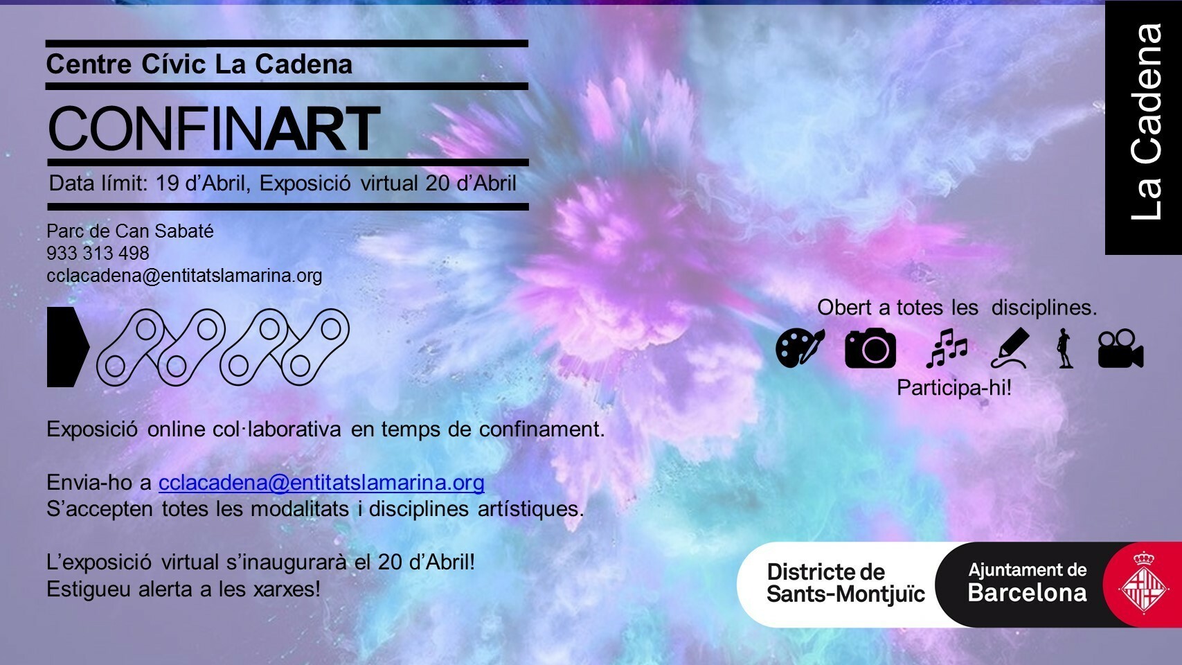 Si vos participar, només cal que ens envïis una fotografia o vídeo de la teva peça d'art a: cclacadena@entitatslamarina.org. Teniu temps fins al 19 d'abril!