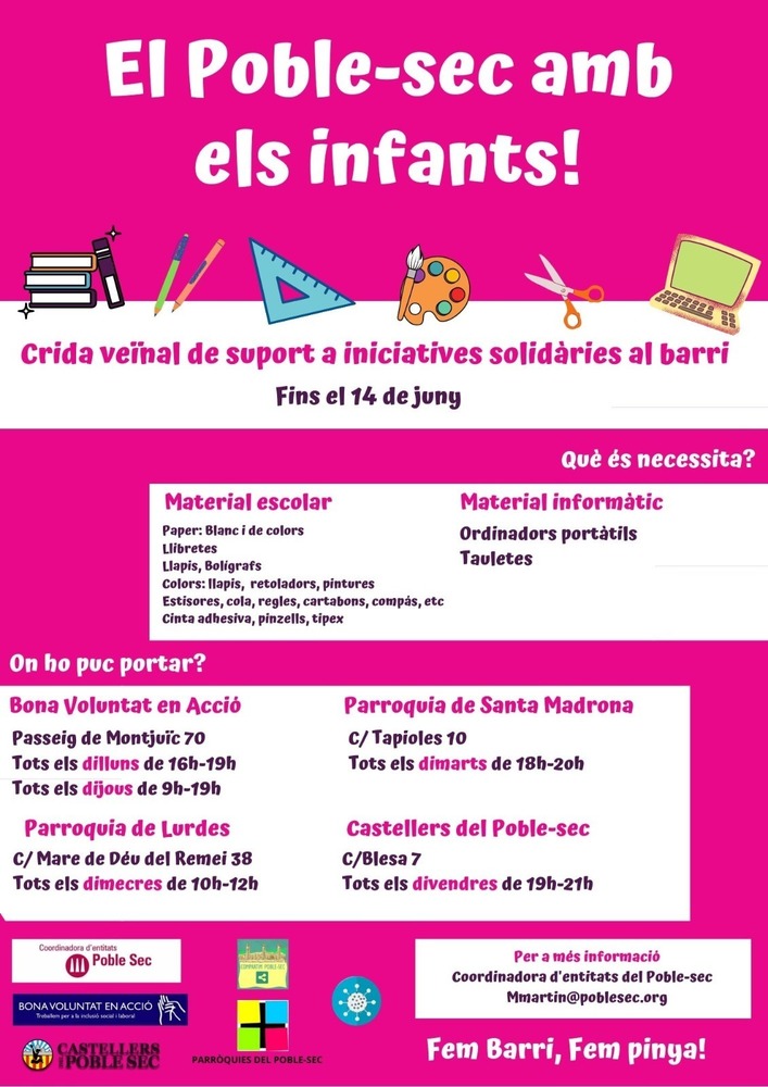Les entitats del Poble-sec recullen material escolar perquè tots els nens i nenes del barri tinguin els recursos necessaris per seguir estudiant des de casa: bolígrafs, llàpissos, retoladors, paper, llibretes, ceres i llàpissos de colors, regles, cinta adhesiva... i tot tipus de material per a manualitats. També cal material informàtic (ordinadors portàtils i tauletes). Punts i horaris de recollida:
