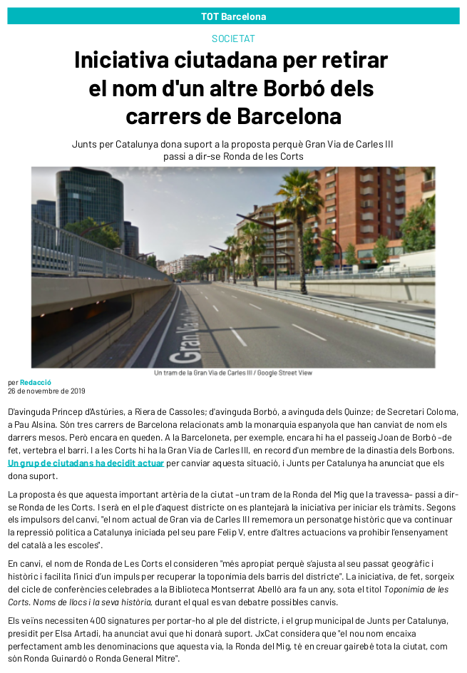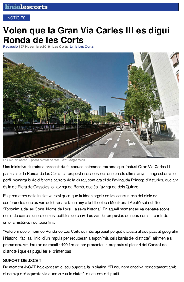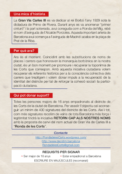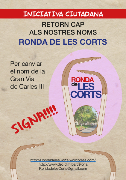 Aquesta iniciativa ciutadana té l'objectiu de presentar a l'Ajuntament de Barcelona les 400 signatures vàlides necessàries per presentar al Plenari del Consell de districte de Les Corts la proposta de canvi de denominació de la Gran via de Carles III pel nom de Ronda de les Corts .