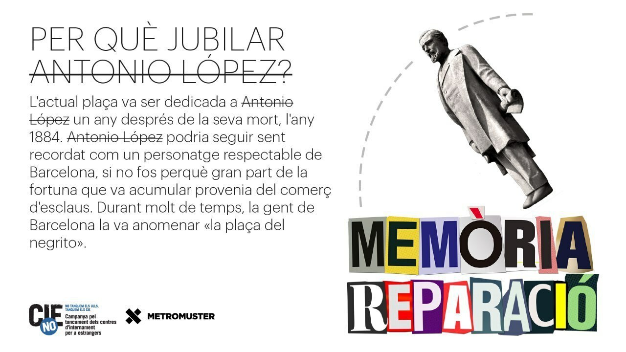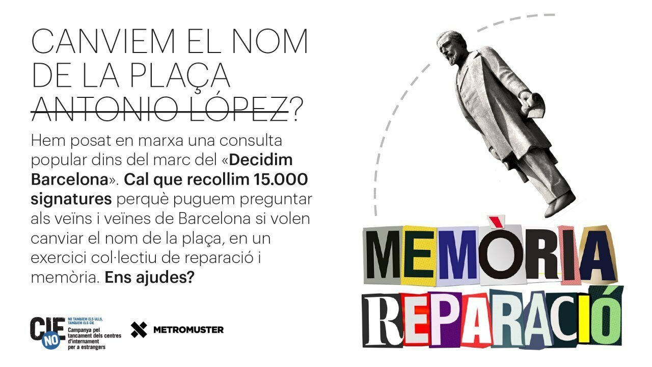 El col·lectiu Tanquem els CIE proposem als veïns i veïnes de Barcelona substituir el nom de la Plaça Antonio López pel d’Idrissa Diallo, amb la finalitat de reparar simbòlicament la seva mort, commemorar les lluites i resistències migrants i qüestionar i trencar el costum d’honrar la tradició esclavista catalana mitjançant estàtues i plaques a la nostra ciutat.