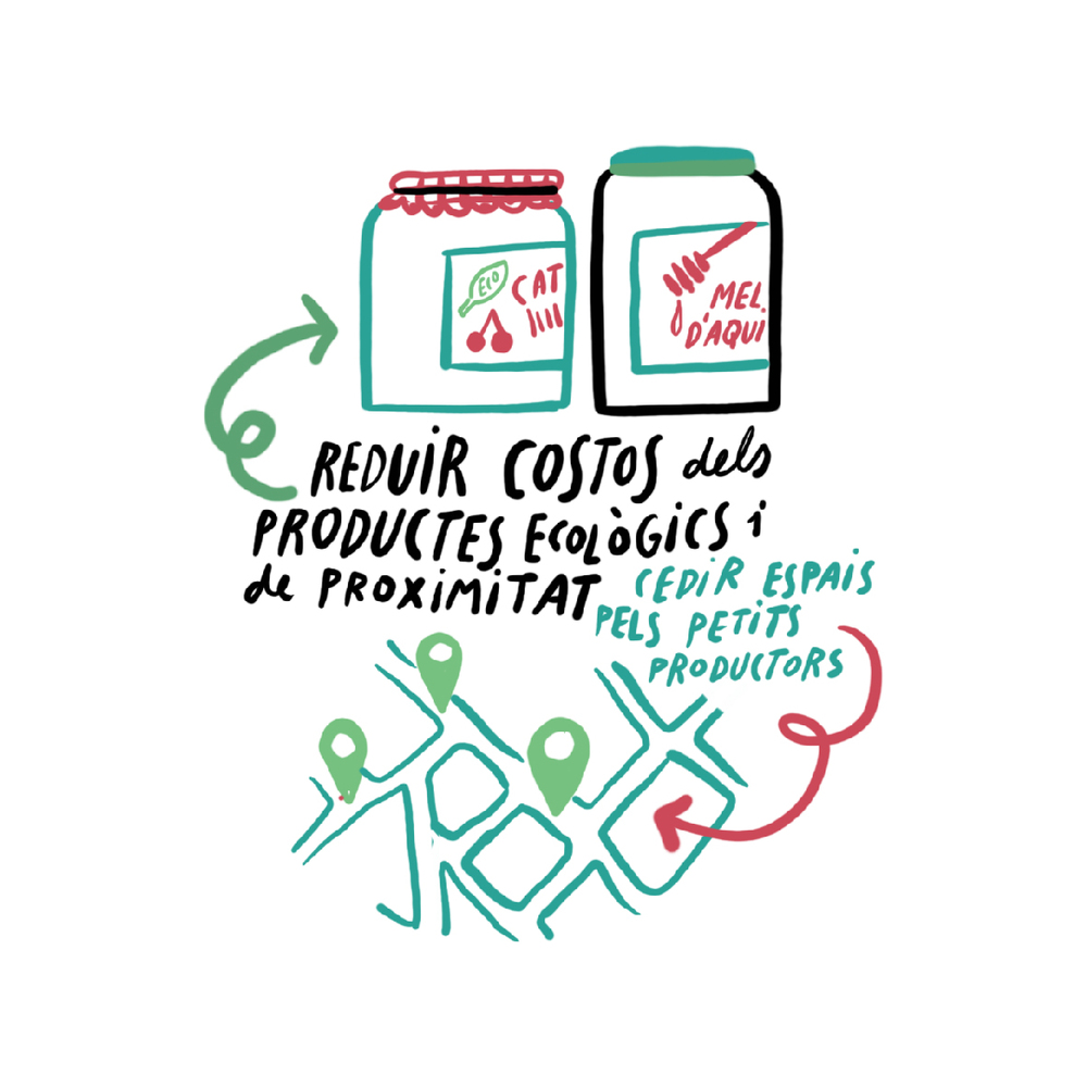Crear una infraestructura de suport al comerç ecològic i de proximitat. Això inclou la cessió d’espais públics perquè petits productors facin vendes directes i suport tècnic per a la creació i gestió de cooperatives, entre altres iniciatives.