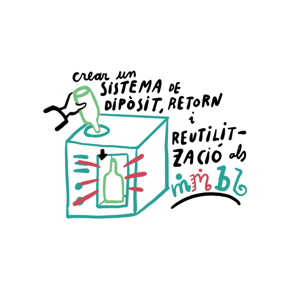 Crear un sistema de dipòsit i retorn d’envasos a la xarxa de mercats municipals per reutilitzar-los. Avaluar el funcionament i ampliar progressivament el sistema a altres comerços. Acompanyar la mesura d’una targeta de fidelització en què, després de 10 usos d’aquest sistema, s’obtinguin vals de descompte per properes compres.