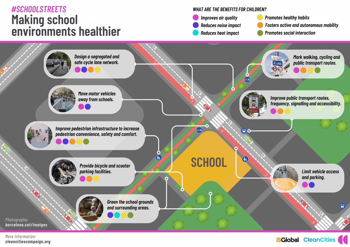 Els centres escolars de la ciutat són "punts calents" d'exposició mediambiental: zones denses i molt contaminades que haurien de ser protegits. Per això demanem al voltant de cada centre: