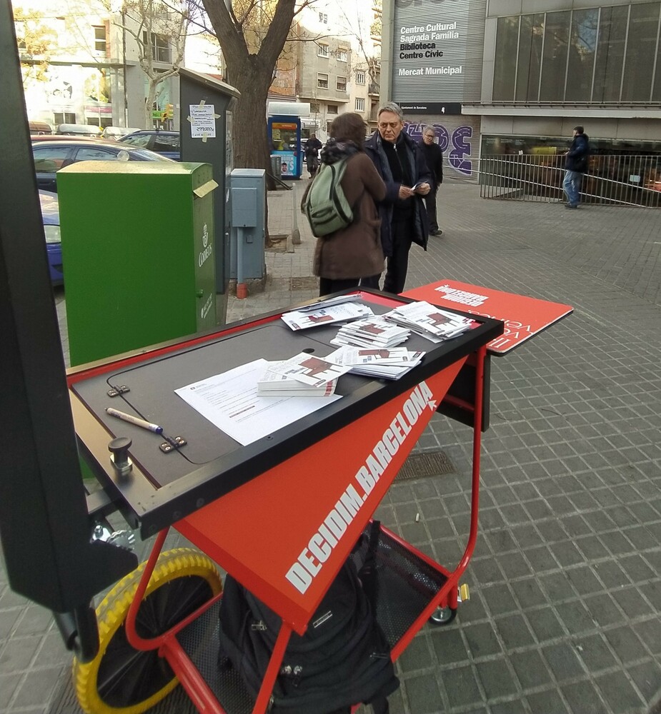 S’ha realitzat l’acte de difusió davant el Mercat de La Sagrada Família, a la cantonada del carrer Padilla davant la porta del Centre Cívic i de la Biblioteca del barri. Hem trobat poc interès per mantenir una conversa sobre els pressupostos participatius i projectes d’inversió. Els 4 acompanyaments que hem fet, han sigut sobre informació per a persones que ja estaven donades d’alta al Decidim sobre terminis i costos estimatius dels projectes. Així mateix vam entrar al mercat a fer difusió entre els paradistes i de les 7 parades entrevistades, en sis les persones treballadores vivien fora de Barcelona.