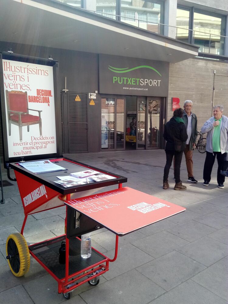 El punt de difusió realitzat al carrer Marmellà a l’entrada del Centre Esportiu va discorrer sense incidents. Va haver-hi molts usuaris que es dirigien al centre i que es van aturar a preguntar i opinar sobre les necessitats del barri. Ens hem trobat amb alguna gent del districte de Gràcia. Com a valoració general, ha estat una bona localització i hora, ja que la gent no hi anava amb pressa, mostra interés i té temps per aturar-se. Informant sobre el Consell de Barri que tindria lloc al dia següent hem vist que la gent coneix força els canals de participació de l’Ajuntament.