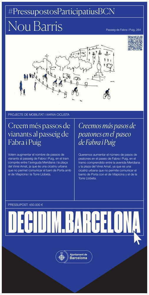 Descripció ampliada: Volem augmentar el nombre de passos de vianants al passeig de Fabra i Puig, en el tram comprès entre l’avinguda Meridiana i la plaça del Virrei Amat, ja que és una cicatriu urbana que no permet comunicar el barri de Porta amb el de Vilapicina i el de Torre Llobeta.