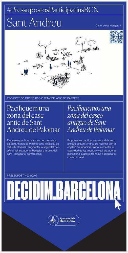Descripció breu: Proposem pacificar una zona del casc antic de Sant Andreu de Palomar amb l’objectiu de reduir-hi el trànsit, augmentar la seguretat dels veïns i veïnes, aportar benestar a la gent del barri i impulsar el comerç local.