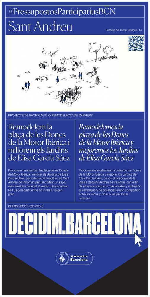 Descripció breu: Proposem reurbanitzar la plaça de les Dones de Motor Ibèrica i millorar els Jardins d’Elisa Garcia Saez, als voltants de l’església de Sant Andreu de Palomar, per tal d’oferir un espai més amable i ordenat al veïnat i de potenciar-ne l’ús compartit entre els infants i la gent gran.