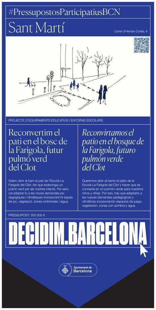 Descripció breu: Plantegem obrir al barri el pati de l’Escola La Farigola del Clot i fer que esdevingui un pulmó verd per als nostres infants. Per això, cal adaptar-lo a les noves demandes pedagògiques i climàtiques incorporant-hi espais de joc, vegetació, zones ombrívoles i aigua.