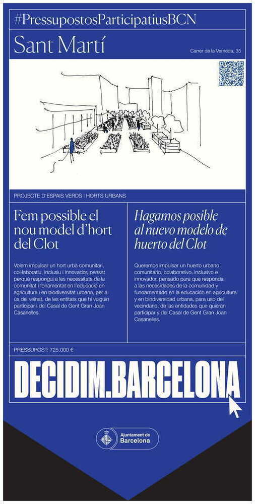 Descripció breu: Plantegem impulsar un hort urbà comunitari, col·laboratiu, inclusiu i innovador, pensat perquè respongui a les necessitats de la comunitat i fonamentat en l’educació en agricultura i en biodiversitat urbana, per a ús del veïnat, de les entitats que hi vulguin participar i del Casal de Gent Gran Joan Casanelles.
