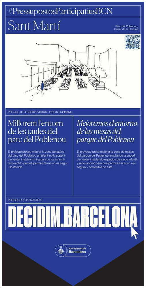 Descripció breu: El projecte preveu millorar la zona de taules del parc del Poblenou ampliant-ne la superfície verda, instal·lant-hi espais de joc infantil i renovant-lo perquè permeti fer-ne un ús segur i sostenible.