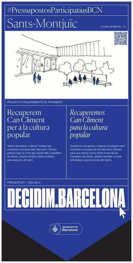 Descripció breu: Volem recuperar i millorar l’antiga nau industrial municipal dels Germans Climent perquè sigui la nova seu social dels Castellers de Sants, oberta també a altres entitats i associacions del barri.