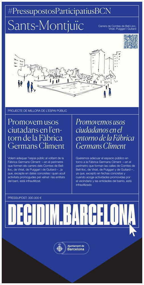 Descripció breu: Volem adequar l’espai públic al voltant de la Fàbrica Germans Climent —en el perímetre que formen els carrers dels Comtes de Bell-lloc, de Viriat, de Puiggarí i de Guitard—, ja que, excepte en dates concretes i quan acull activitats promogudes pel veïnat i les entitats del barri, està infrautilitzat.