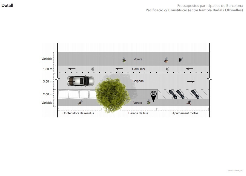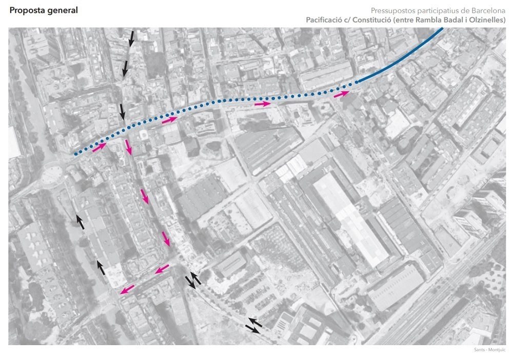 Descripció ampliada: Proposem transformar un tram del carrer de la Constitució —el comprès entre la rambla de Badal i el carrer d’Olzinelles— en una via de sentit únic, en direcció Besòs, i limitar-hi la velocitat de circulació a 30 km/h.