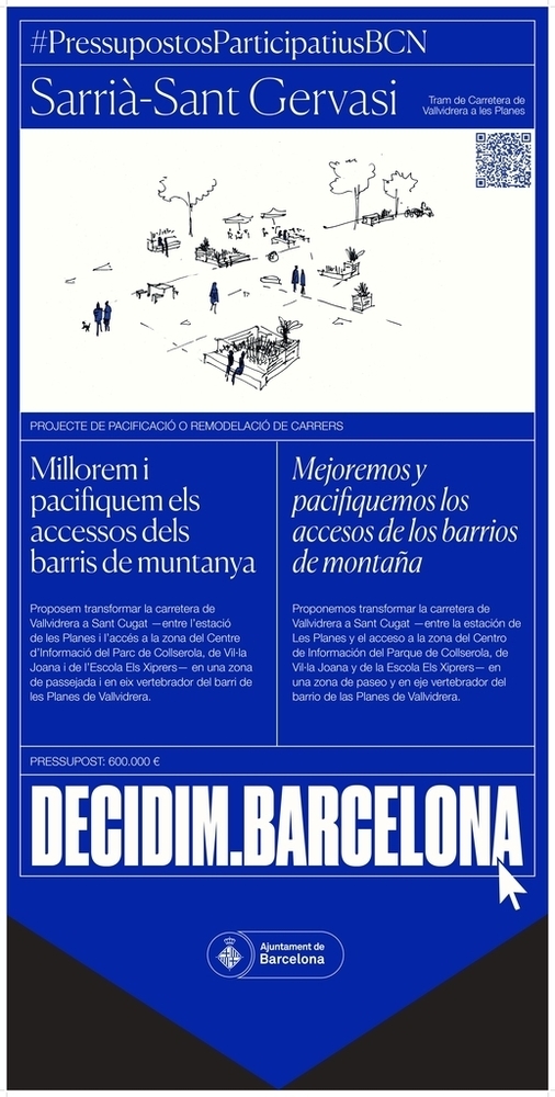 Descripció breu: Proposem transformar la carretera de Vallvidrera a Sant Cugat —entre l’estació de les Planes i l’accés a la zona del Centre d’Informació del Parc de Collserola, de Vil·la Joana i de l’Escola Els Xiprers— en una zona de passejada i en eix vertebrador del barri de les Planes de Vallvidrera.