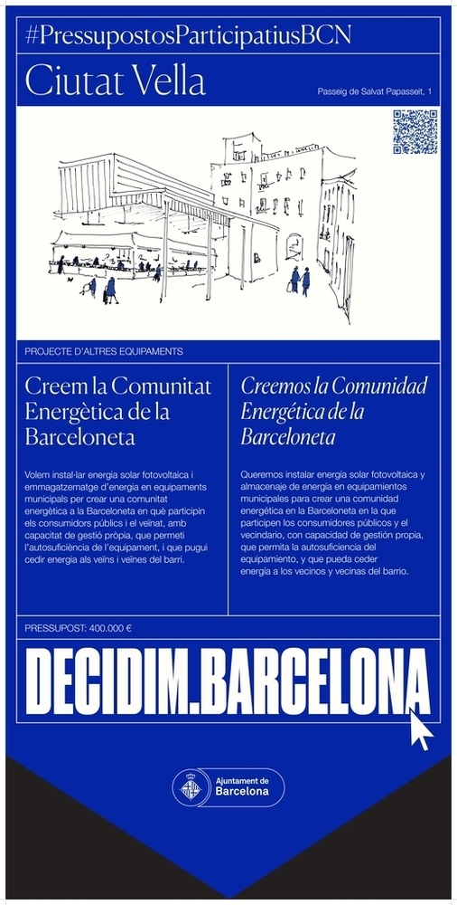 Descripció breu: Volem instal·lar energia solar fotovoltaica i emmagatzematge d’energia en equipaments municipals per crear una comunitat energètica a la Barceloneta en què participin els consumidors públics i el veïnat, amb capacitat de gestió pròpia, que permeti l’autosuficiència de l’equipament, i que pugui cedir energia als veïns i veïnes del barri.