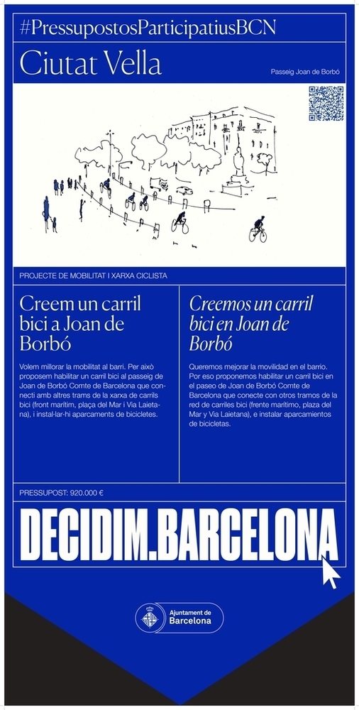 Descripció breu: Volem millorar la mobilitat al barri. Per això proposem habilitar un carril bici al passeig de Joan de Borbó Comte de Barcelona que connecti amb altres trams de la xarxa de carrils bici (front marítim, plaça del Mar i Via Laietana), i instal·lar-hi aparcaments de bicicletes.