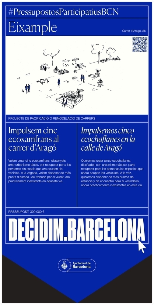 Descripció breu: Volem crear cinc ecoxamfrans, dissenyats amb urbanisme tàctic, per recuperar per a les persones els espais que ara ocupen els vehicles.