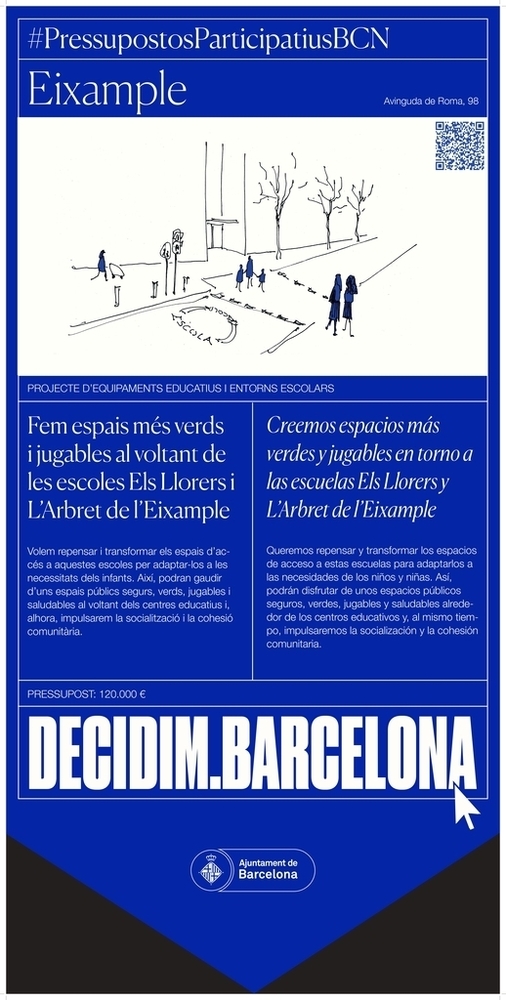 Descripció breu: Volem repensar i transformar els espais d’accés a aquestes escoles per adaptar-los a les necessitats dels infants. Així, podran gaudir d’uns espais públics segurs, verds, jugables i saludables al voltant dels centres educatius i, alhora, impulsarem la socialització i la cohesió comunitària.