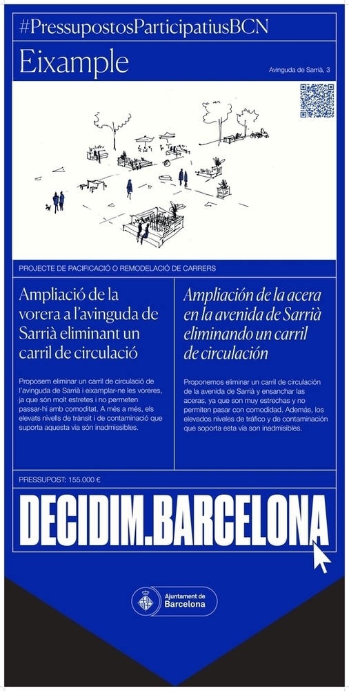 Descripció breu: Proposem eliminar un carril de circulació de l’avinguda de Sarrià i eixamplar-ne les voreres, ja que són molt estretes i no permeten passar-hi amb comoditat. A més a més, els elevats nivells de trànsit i de contaminació que suporta aquesta via són inadmissibles.