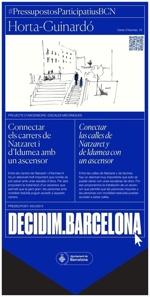 Descripció breu: Entre els carrers de Natzaret i d’Idumea hi ha un desnivell molt important que només es pot salvar amb unes escales d’obra. Per això proposem la instal·lació d’un ascensor que permeti que la gent gran i les persones amb mobilitat reduïda puguin accedir a aquests carrers.