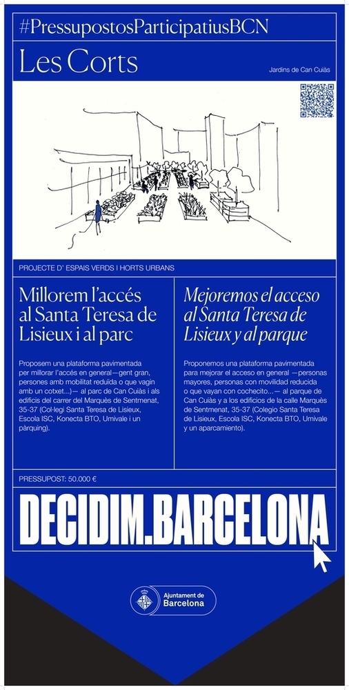 Descripció breu: Proposem una plataforma pavimentada per millorar l’accés en general—gent gran, persones amb mobilitat reduïda o que vagin amb un cotxet...)— al parc de Can Cuiàs i als edificis del carrer del Marquès de Sentmenat, 35-37 (Col·legi Santa Teresa de Lisieux, Escola ISC, Konecta BTO, Umivale i un pàrquing).