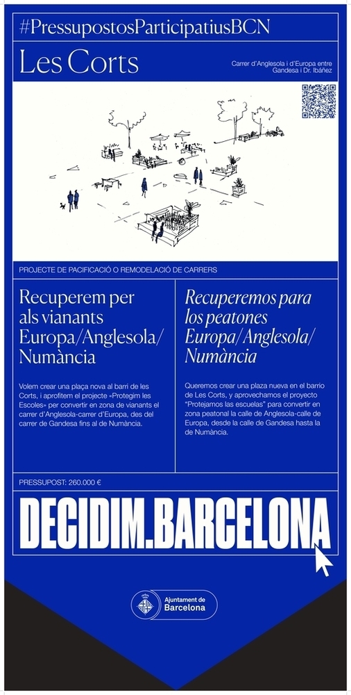 Descripció breu: Volem crear una plaça nova al barri de les Corts, i aprofitem el projecte «Protegim les Escoles» per convertir en zona de vianants el carrer d’Anglesola-carrer d’Europa, des del carrer de Gandesa fins al de Numància.