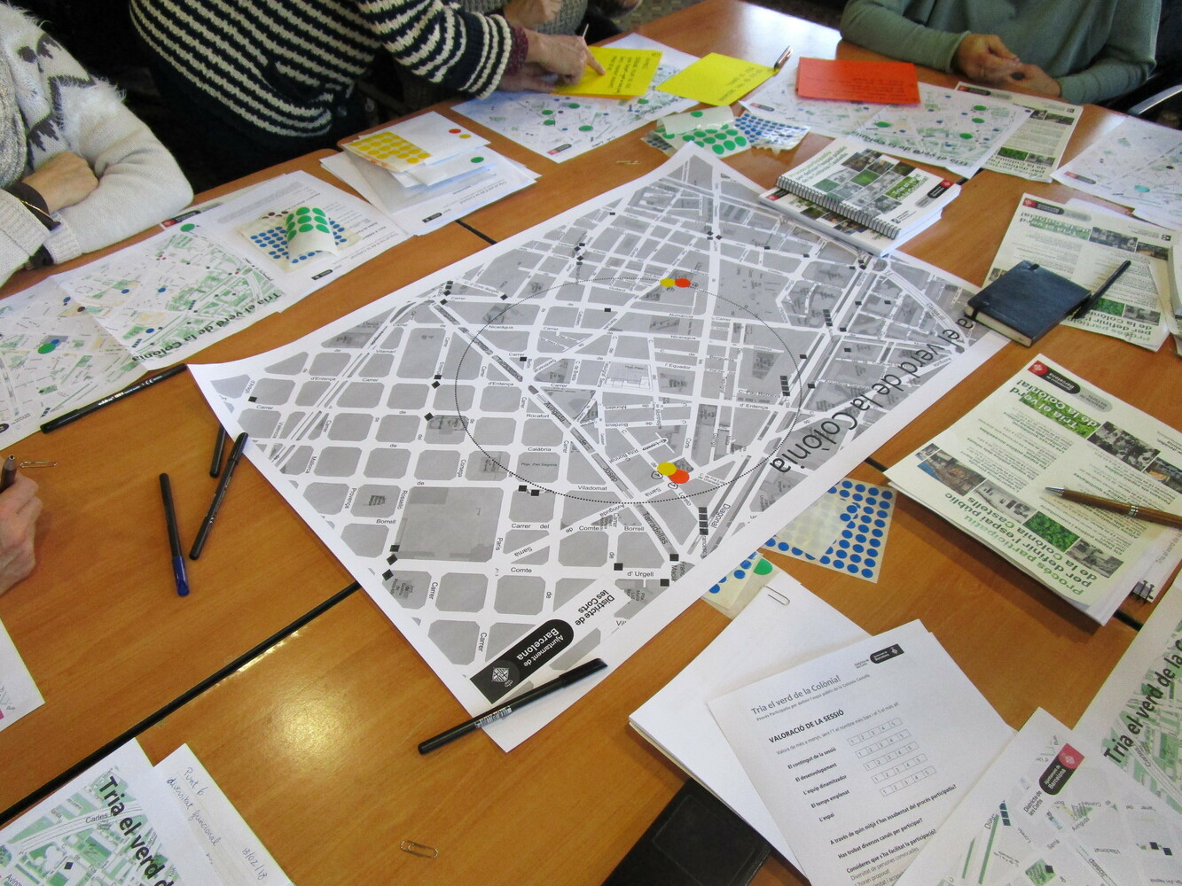 Es va proposar un exercici individual per a ubicar en un plànol els equipaments, serveis i espais públics on fan activitats quotidianament i per a reflexionar sobre quines qüestions els hi agrada més, quins menys i el perquè. Després es va fer un exercici de valoració en grups per descriure característiques físiques i socials dels espais públics del barri amb la finalitat de anomenar com aquest espais són favorables o desfavorables per a les seves activitats i quines qüestions es poden tenir en compte per començar a proposar el nou espai públic de la Colònia Castells.