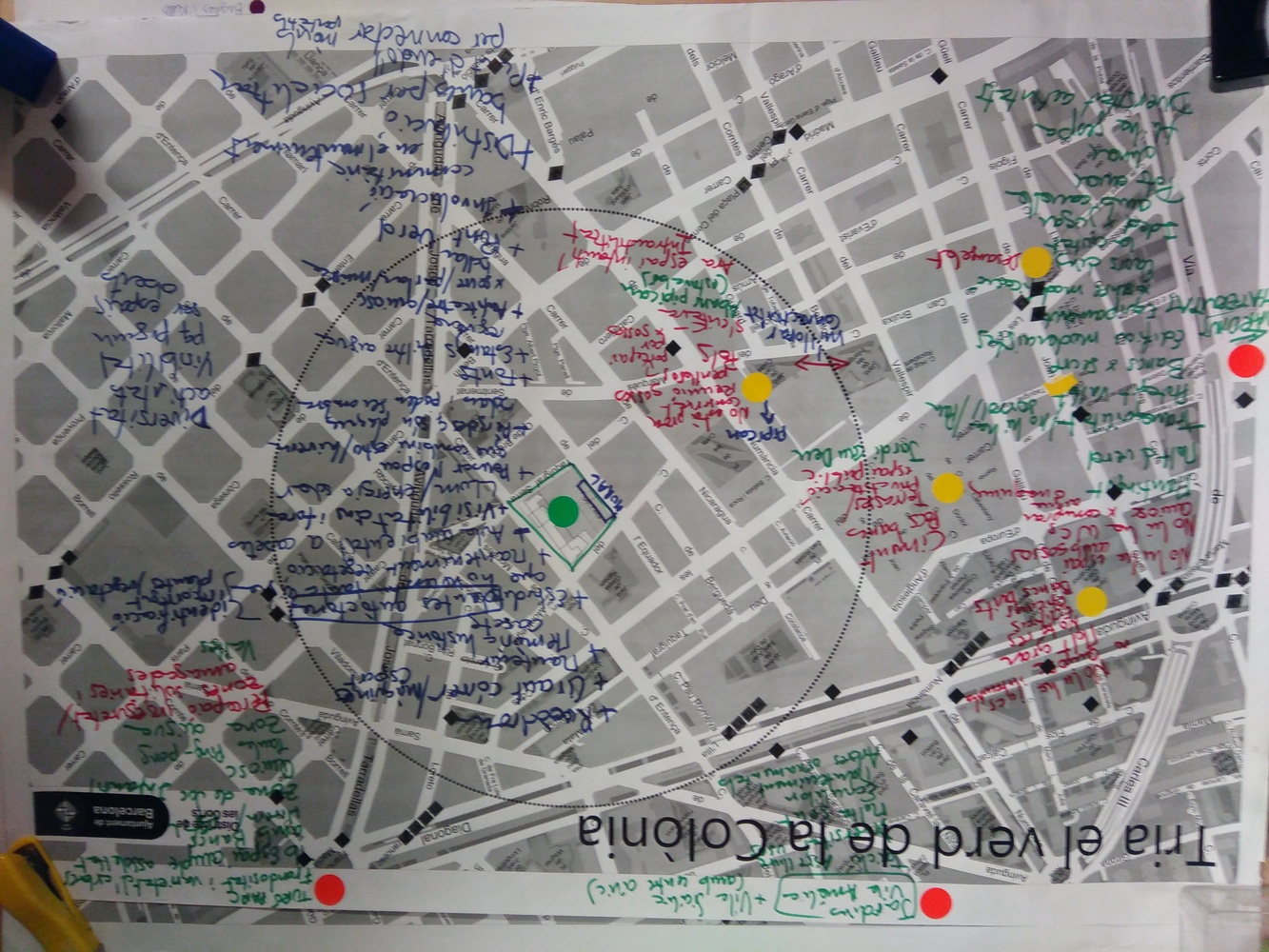 Descripció qualitativa del desenvolupament de la sessió: Es va fer primer un exercici individual per identificar la xarxa quotidiana de les dones participants: quins equipament, serveis i espais del barri fan servir en el seu dia a dia, com es mouen pel barri, quins comerços fan servir, etc. Després es va fer un exercici de valoració dels espais públics que utilitzaven, indicant quins elements d’aquests espais eren favorables o desfavorables per a la seva vida quotidiana.