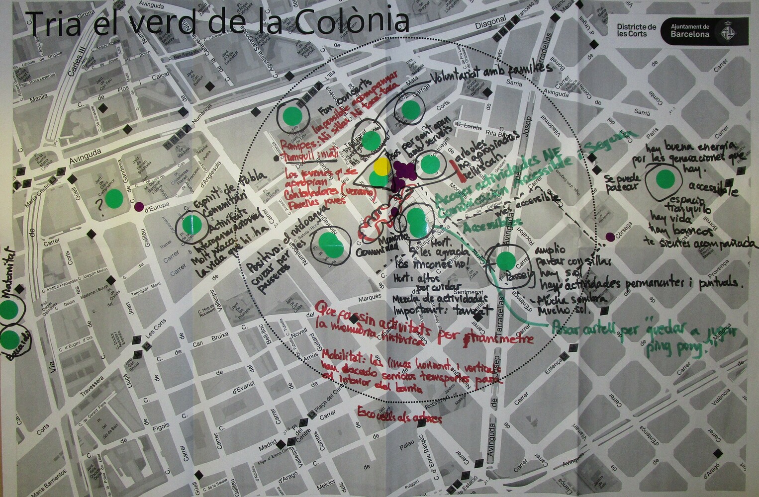 Respecte a l’Illa de la Colònia Castells valoren l’hort que s’ha posat en taules i creuen que és una activitat on es poden implicar. No els agraden els racons que hi ha actualment. Proposen que hi hagi barreja d’activitats i persones, que sigui un espai tancat a la nit i que la comunicació entre les voreres del c/ Montnegre siguin accessibles, segures i contínues.