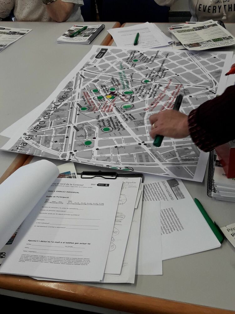 Descripció qualitativa del desenvolupament de la sessió: Es va proposar treballar conjuntament tot el desenvolupament de la sessió. Amb l’ajuda de les dinamitzadores van ubicar en un plànol els espais públics on les persones participants desenvolupen activitats quotidianament. Després van passar a reflexionar i descriure característiques físiques i socials dels espais públics del barri amb la finalitat d’anomenar com aquests espais són favorables o desfavorables per a les seves activitats i quines qüestions es poden tenir en compte per començar a proposar el nou espai públic de la Colònia Castells.