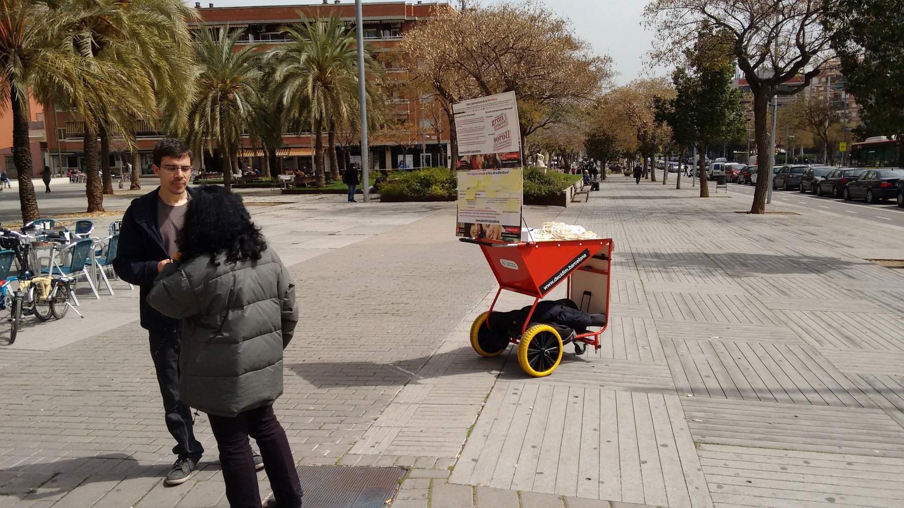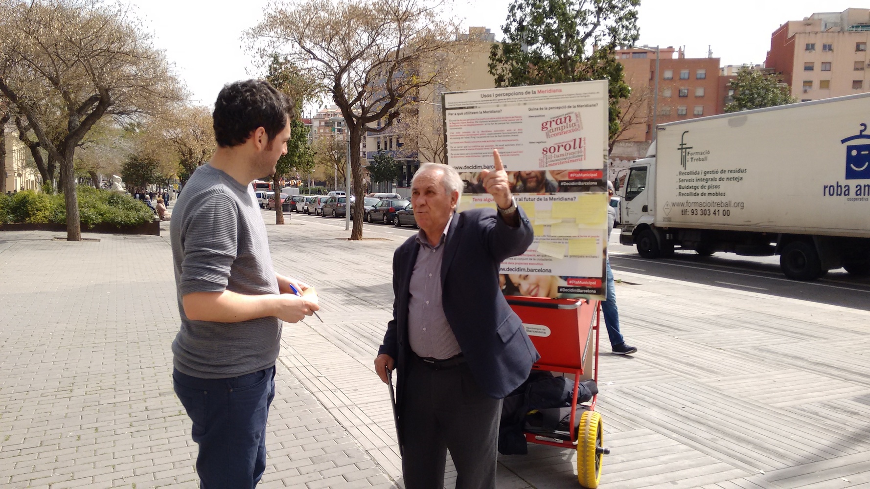 El taller va consistir en el muntatge d'un element de difusió d'informació com és el carro mòbil del Pla d'Acció Municipal durant el matí a dos llocs concrets del districte de Sant Andreu, en llocs propers a l'Avinguda Meridiana. Durant la primera part del matí el carro amb dos dinamitzadors va estar ubicat a la plaça Mossèn Clapés de Sant Andreu, mentre que al migdia es va traslladar la ubicació als Jardins d'Elx de La Sagrera.L'objectiu de la cita era, d'una banda, validar les principals idees sorgides als debats amb les entitats del districte sobre la situació i el futur de l'Avinguda Meridiana i, de l'altra, recollir algunes propostes genèriques de la ciutadania al voltant de com s'imaginaven la Meridiana en el futur.Al llarg de la jornada van participar més d'una trentena de persones que varen ser informades de les idees de la diagnosi participativa duta a terme al districte de Sant Andreu i van poder donar la seva opinió al voltant d'aquestes, així com formular propostes de millora de cara al futur.Les afirmacions derivades de la diagnosi sobre l'ús que fa la ciutadania de l'espai eren aquestes:- És una via de pas per anar d'un punt a un altre entre els barris de Navas, la Sagrera i Sant Andreu. Els vianants tendeixen a evitar passar per la Meridiana en els seus desplaçaments i si ho fan és perquè realitzen moviments transversals- L'ús més intensiu de la Meridiana coincideix amb els intercanviadors de transport públic, especialment l'encreuament amb el passeig de Fabra i Puig i la parada de bus de Sant Andreu Arenal- La vorera mar/Besòs concentra més activitat i més desplaçaments- És un carrer que no s'utilitza per passejar. No acull activitats d'oci o d'estada atesa la manca d'espais verds i d'ús ciutadà- És un eix bàsic per a la mobilitat amb bicicleta, malgrat que el carril bici és discontinu i amb obstacles, i que genera problemes amb els vianantsLa percepció de la Meridiana tenia a veure amb:- Idees positives:Gran, àmplia, connexió, espai públic, transport públic, Can Dragó, accessible.- Idees negatives:Soroll, contaminació, il·luminació, vianants/ciclistes, manteniment, trànsit, mobiliari urbà, zones de càrrega i descàrrega.Les principals opinions que ens van fer arribar els vianants dels dos llocs on va estar ubicat l'estand informatiu foren aquestes:§ En general d'acord amb la diagnosi§ Està bé, no volen canvis +2§ Les voreres estan bé d'ample§ És una barrera entre nord i sud§ És una frontera la Meridiana§ Hi ha gent que va a passejar a Can Dragó +2§ Els cotxes no respecten els semàfors§ Les bicicletes o no segueixen el carril bici o aquest està mal marcat§ Hi ha diferents interessos a cada tram de la Meridiana i això justifica que es facin actuacions particulars§ A Can Dragó sí que es passeja +2§ Es considera que la Meridiana des del carrer Aragó cap a mar té un trànsit més pacificat i que a la part anterior pot resultar angoixant pel soroll§ Des de Fabra i Puig la circulació va millor, està més pacificada§ A la part superior de la Meridiana, de sortida de Barcelona, es considera que és un lloc de pas i que no ve de gust estar-s'hi ni passejar (també per manca d'espai on fer-ho), no és agradable§ Hi ha molt de soroll i molt vent§ Hi ha problemes més importants que no aquestVam poder constatar, doncs, que els conceptes amb els quals la gent identifica o percep l'avinguda estan molt generalitzats entre el conjunt de la població. També, la majoria d'afirmacions sobre l'ús de l'avinguda són compartides per gran part de la gent preguntada, tot i que alguna amb algun matís important.Un cop explicat a cada persona quines eren les idees principals de la diagnosi, se'ls demanava si tenien alguna idea de futur o proposta de millora que volguessin aportar. Així mateix, se'ls recordava el procés de definició del Pla d'Actuació Municipal i com podien participar-hi a través de la plataforma Decidim.barcelona.