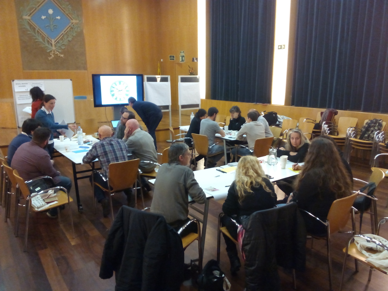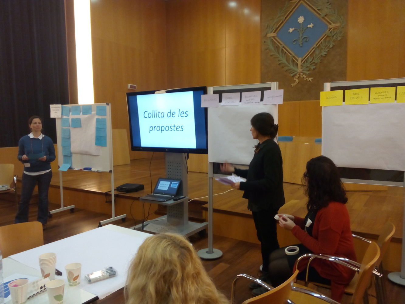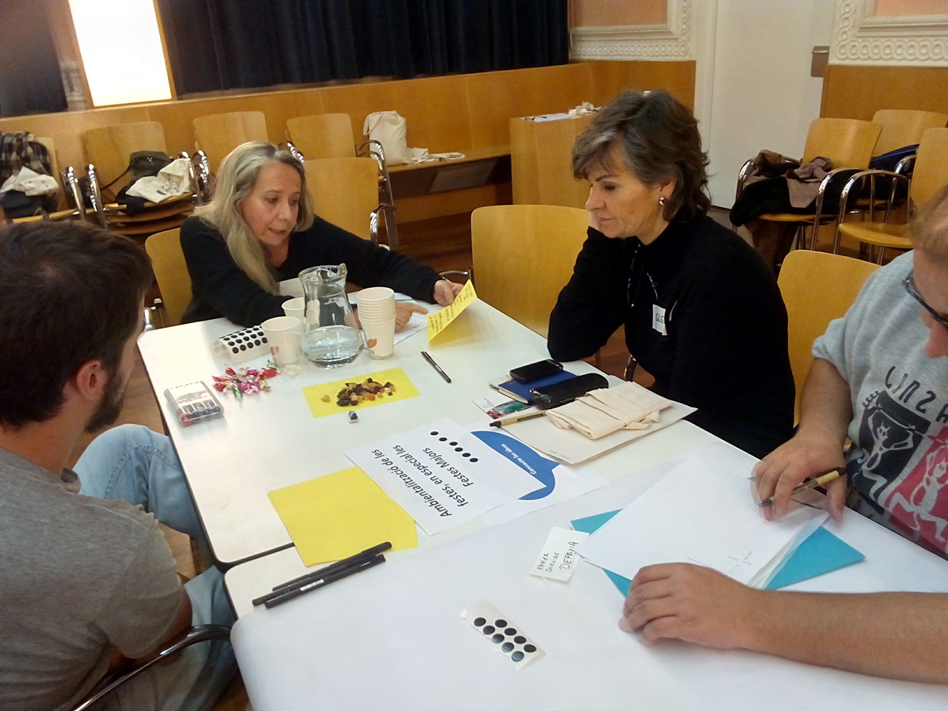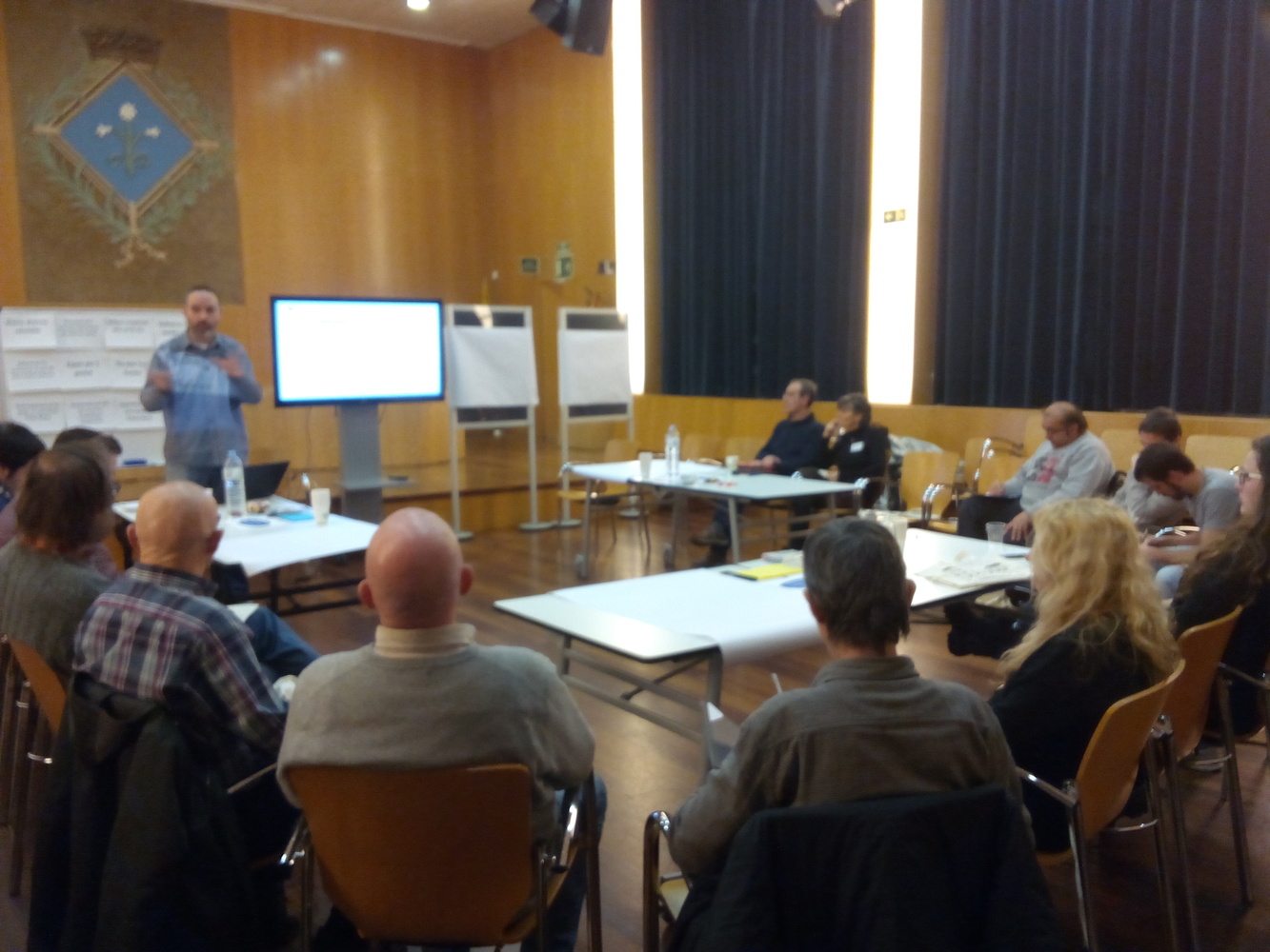 Explicació del Conseller sobre el PAM-PAD, contestant a alguna pregunta dels assistents. Exposició de les propostes de l'Ajuntament relacionades amb el Consell de Sostenibilitat, i priorització entre els assistents de les tres més importants. Organització de tres grups de treball rotatius (tècnica del world-cafè) sobre cada un dels tres temes: AMBIENTALITZACIÓ DE LES FESTES, EN ESPECIAL LES FESTES MAJORS; AULA AMBIENTAL BOSC TURULL I JARDÍ DEL SILENCI; VALLCARCA NOU MODEL URBÀ. L'anfitrió de cada taula explica a la gent que rota el que s'ha treballat prèviament: primera ronda de propostes d'acció, segona ronda de paper del Consell, tercera ronda de compromisos i aliances. Collita de propostes amb debat tranquil, respectuós i constructiu. La facilitació ajuda a aterrar les propostes i transformar-les en possibles accions i actuacions del Consell de Sostenibilitat i Medi Ambient.