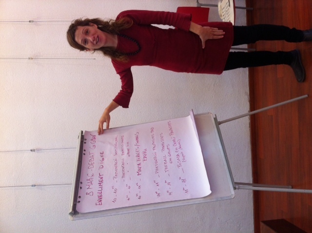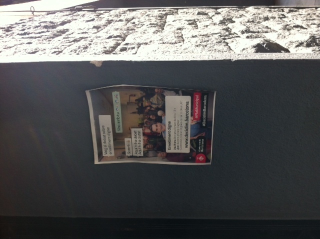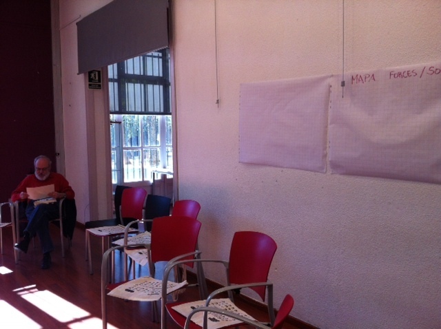 El debat estava programat el matí del dia de la dona i feia una matí assolellat i càlid. Dos quarts abans de l’hora d’inici prevista ja teníem la sala preparada, les cadires en cercle, les parets folrades de paper (per recollir els somnis, potencialitats i propostes per al districte), l’ordre del dia a la vista, la diana i les bosses de tela repartides.A mesura que s’apropava l’hora d’inici ens posàvem a parlar amb les persones que havien arribat abans d’hora, i els demanàvem esperar una mica fins que arribés més gent per poder començar. Vam deixar 5, 10 i 15 minuts cortesia però no venia ningú. Finalment, vam seure amb els dos assistents per fer una mica d’anàlisi de la situació, i vam acordar suspendre el debat.Algunes idees que vam recollir d’aquell matí a la Casa Sagnier van ser:- Cal fer més difusió dels debats en canals accessibles per la gent gran: cartells als portals, explicació als grups i persones assídues als centres cívics sobre el contingut i dinàmica dels debats, etc.- Fer els cartells més entenedors, ja que algunes persones comenten que no s’acaben d’entendre bé,- Parlar amb parròquies i fer el debat al Casal de Can Castelló