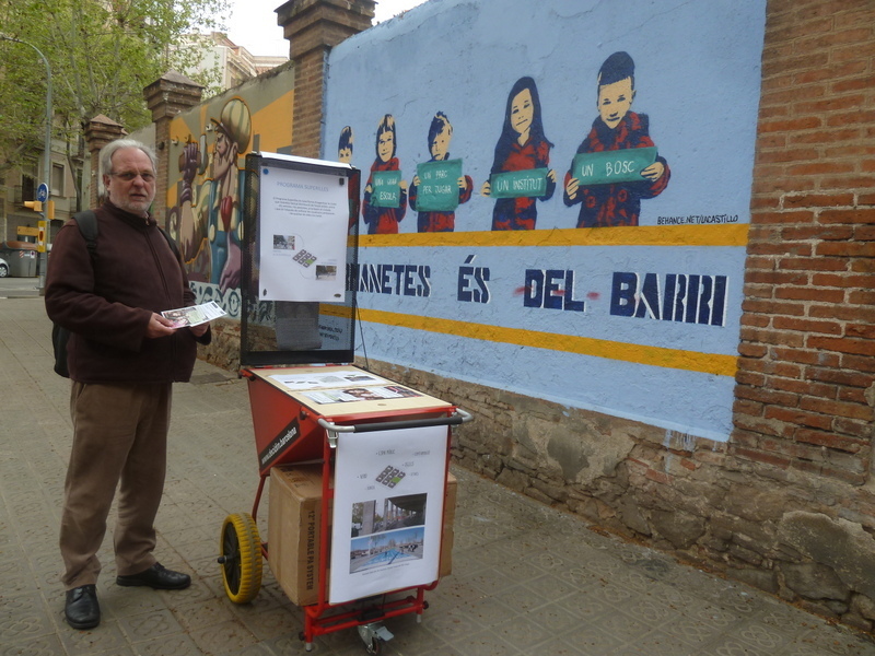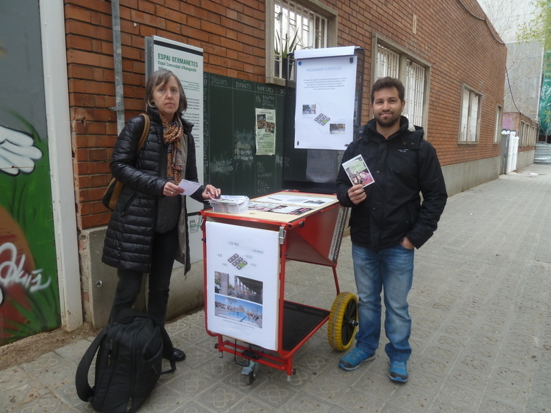 Després d'esperar una hora i de parlar amb els responsables municipals del districte, hem decidit anar distribuint informació amb el carret pels carrers i illes del voltant. Hem informat a les persones sobre el procés participatiu com ho fem habitualment, i a més, hem destacat la invitació al debat sobre les superilles que tindria lloc dilluns.