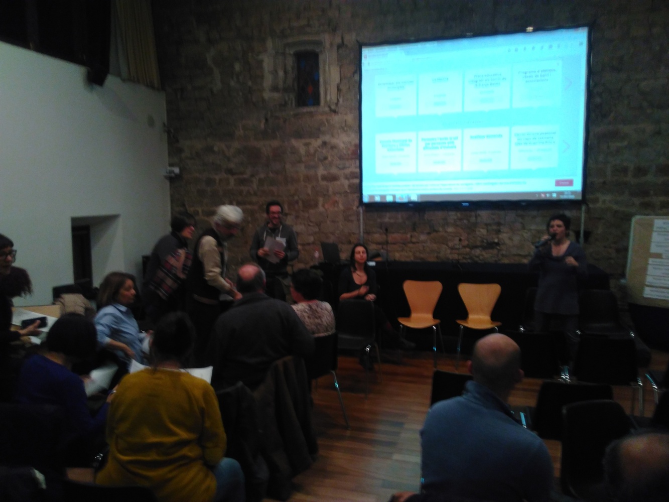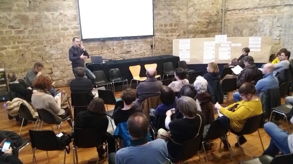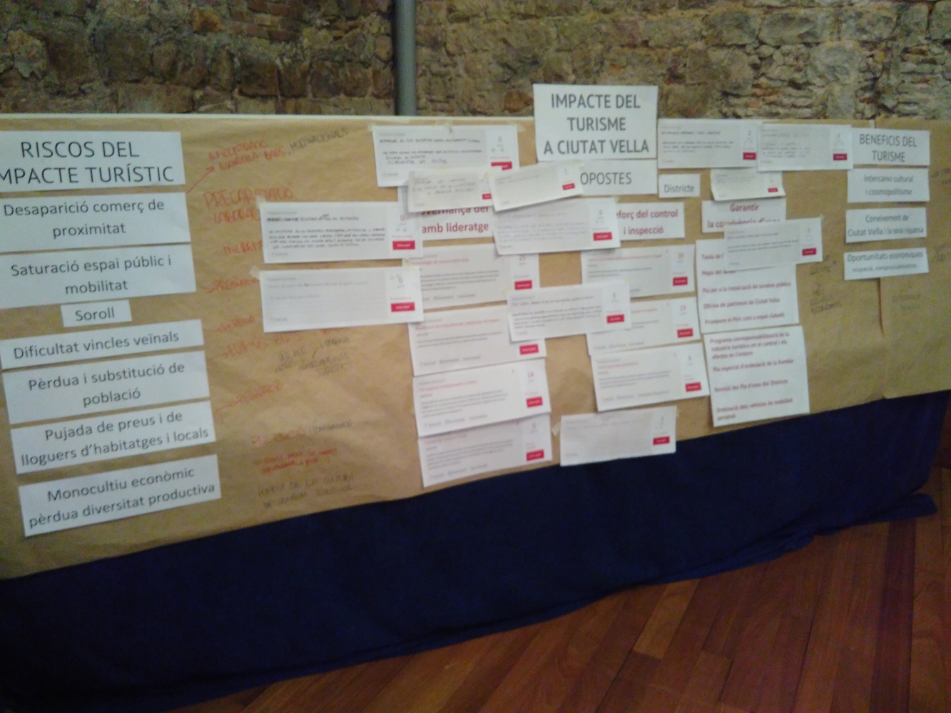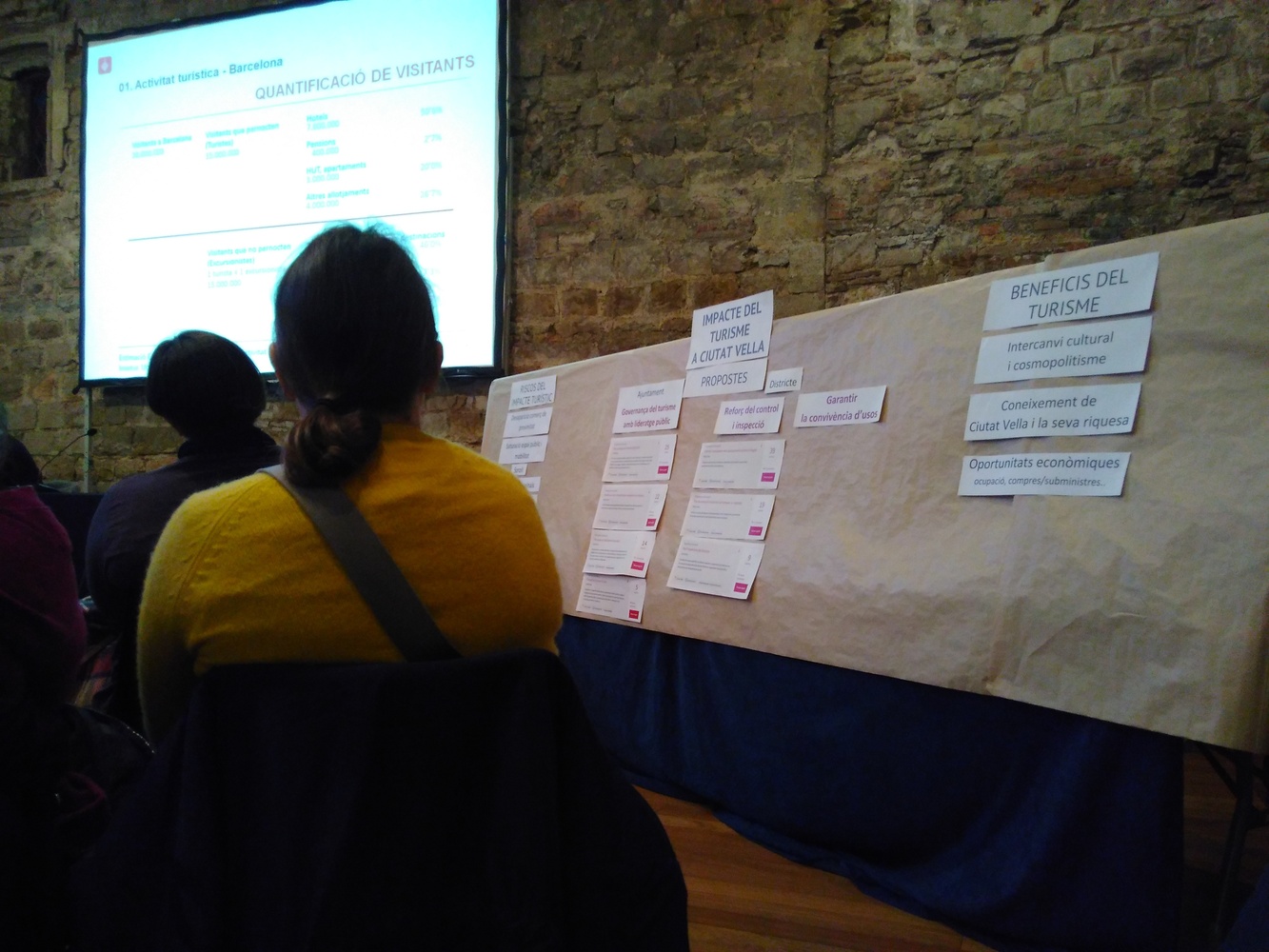 Un cop realitzada la primera part de presentació, es fa una diagnosi col·lectiva partint de la intervenció de Santiago Ibarra, conseller del districte, i recollint les aportacions de les participants a la sessió sobre quins són els riscos que comporta el turisme i quins són els beneficis potencials.