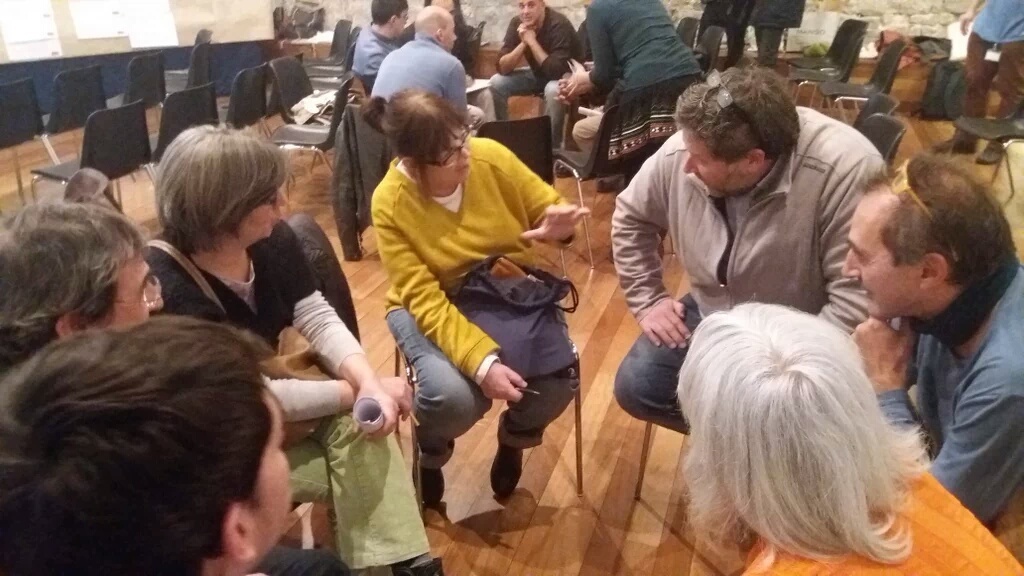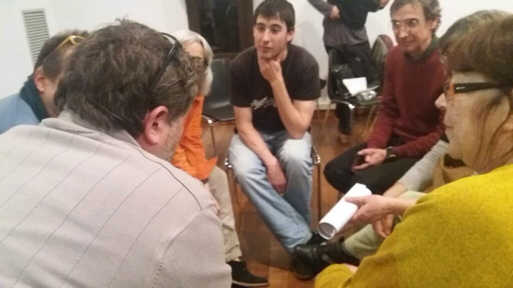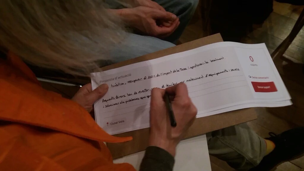 Un cop finalitzada la diagnosi col·lectiva dels impactes del turisme a Ciutat Vella, les persones dinamitzadores van conformar tres grups per facilitar el debat i fomentar la participació de totes les participants que durant 30 minuts van estar debatent sobre diferents propostes i finalment en van posar en comú i recollir per part de l’equip dinamitzador.