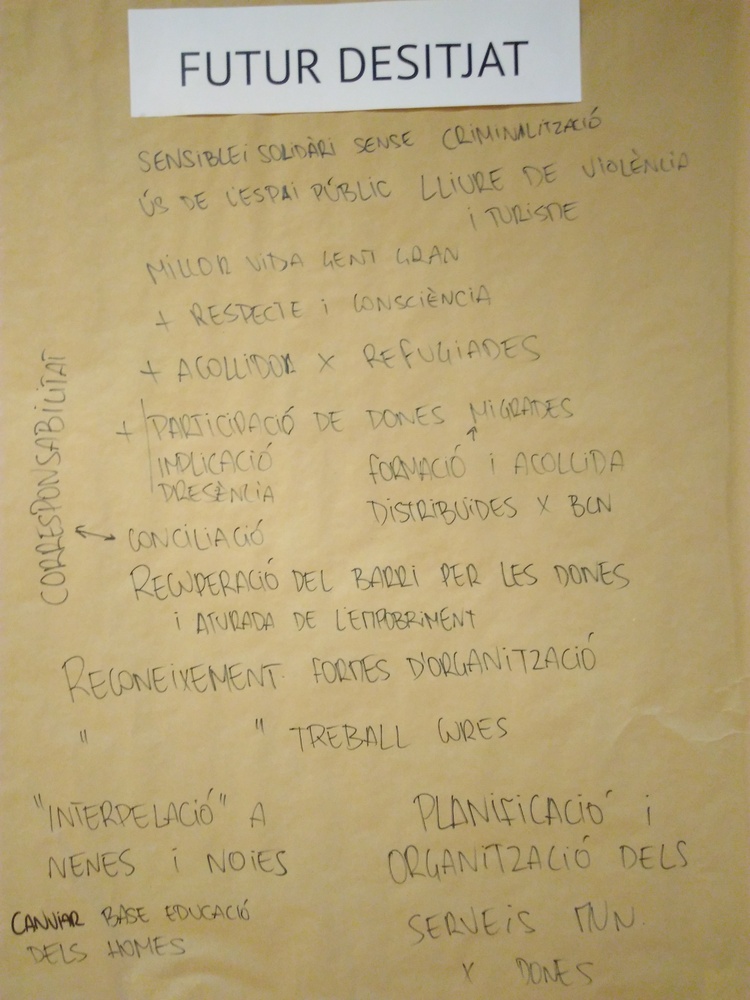 ACTA “DONES A CIUTAT VELLA”15/03El debat “Dones a Ciutat Vella” es celebra a la seu del Districte de Ciutat Vella. La sessió es fa el dilluns 15 de març com a sessió extraordinària del Consell de Dones de Ciutat Vella. Hi assisteixen 31 dones. El grup d'edat més nombrós és el de 25 a 45, amb 20 persones. A continuació ho és el grup d'edat d'entre els 45 i els 65 anys.La sessió comença amb la presentació per part de la consellera de distrticte Eva Alfama, que explica el procés participatiu del PAM i el PAD i el funcionament del portal web, fa un repàs de les sessions fetes i d'aquelles pendents. A continuació fa una explicació de la diagnosi de problemàtiques i necessitats (violència masclista, feminització de la pobressa, educació i formació, treball i salut) de la qual es parteix i les propostes (perspectiva de diversitat en polítiques d'equitat de gènere, desigualtats en salut, estratègia de salut sexal i reproductiva, espai públic amb perspectiva de gènere i transversalitat de gènere en les polítiqes municipals) presents a l'esborrany del PAM i PAD elaborat des de l'equip de govern.A continuació la persona encarregada de la dinamització de la sessió exposa les dinàmiques que es faran i s'inicia el debat en plenària per tal de realitzar una diagnosi col·lectiva sobre les necessitats i problemes.Després d'aquesta primera dinàmica es fa una pluja d'idees de com es veu el futur i quines propostes de llarg recorregut es poden desenvolupar. Un cop finalitzada aquesta dinàmica es passa a fer debats en dos grups sobre propostes concretes durant 40 minuts.Un cop passats els 40 minuts, les propostes dels dos grups es posen en comú i es fa la cloenda de la sessió en la qual s'explica la traçabilitat de les propostes i s'explica el procés posterior a la finalització del procés participatiu del PAM, on es farà la valoració de totes aquelles propostes amb major nombre de suports.La consellera Eva Alfama eplica que més enllà del PAM i el PAD, les propostes i debats serveixen per enriquir la feina que es fa des dels Districtes i el Consell de Dones per tenir més idees i poder treballar en la línia dels temes que hagin sortit al llarg del procés. També s'expliquen les sortides que es fan pels barris de Ciutat Vella amb el carretó que pretén fomentar la interacció i participació ciutadana de qui no intervé a través dels debats, les entitats o la web.Al finalitzar la sessió algunes de les participants comenten que s'hauria de procurar que no hi hagués solapaments en les reunions i sessions que tenen la mateixa temàtica o similar per permetre pdoer participar de tot els espais.