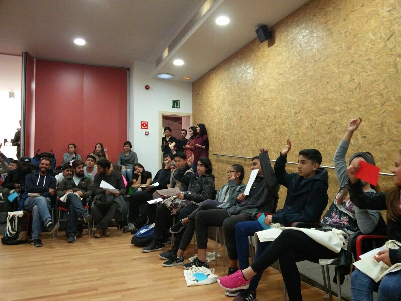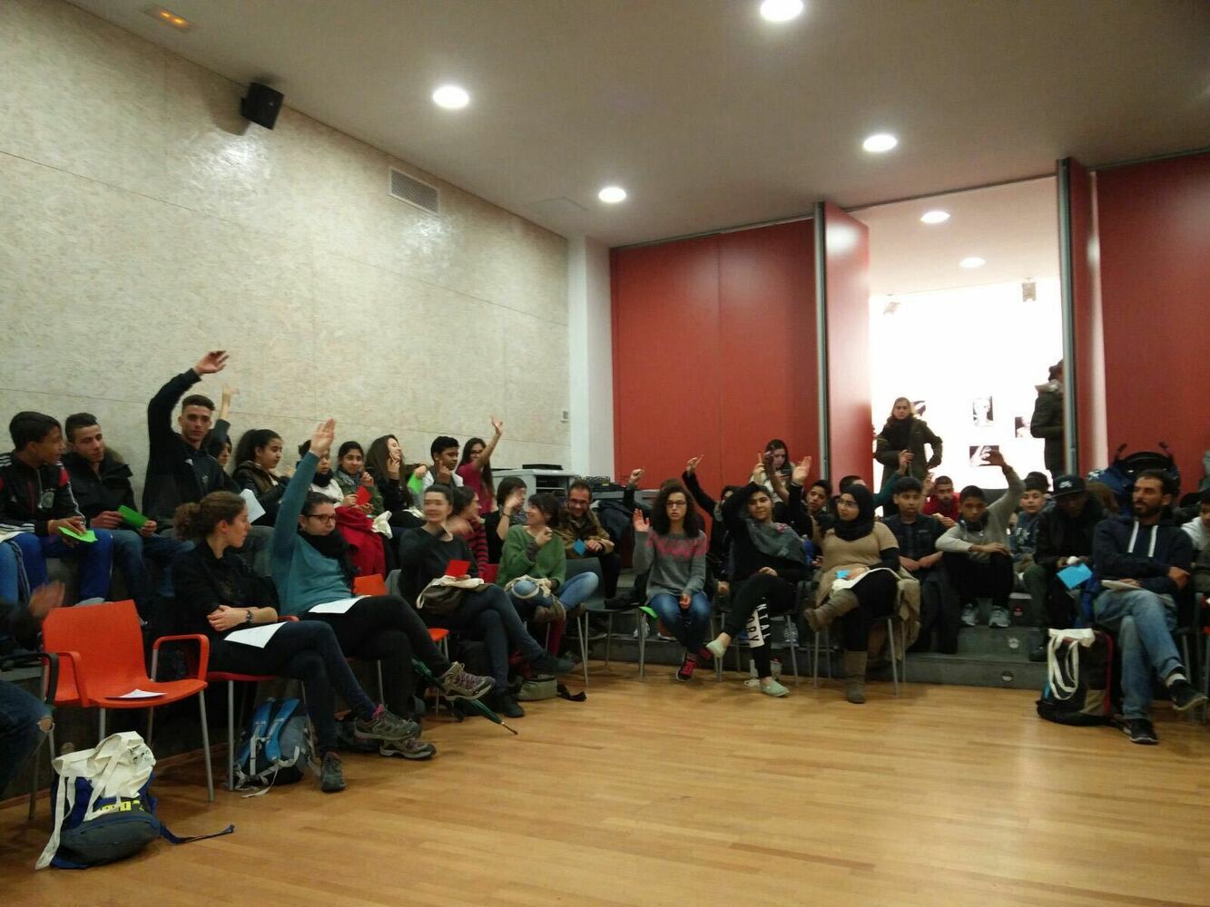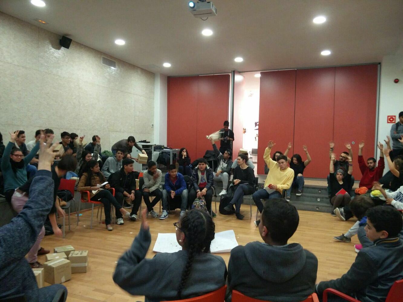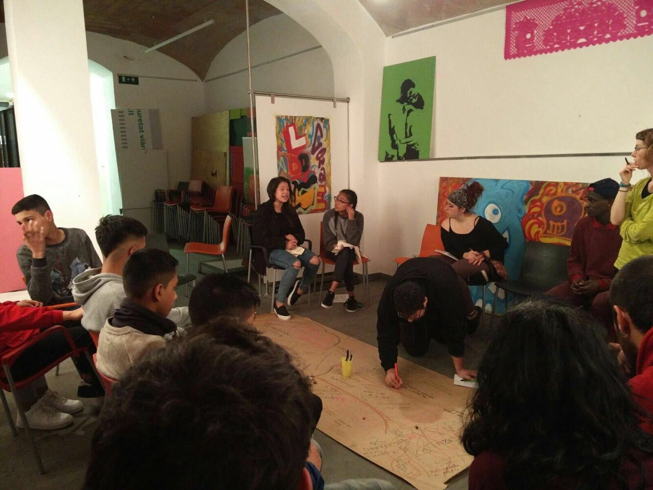 A les 18.00h van anar arribat joves i van anar fent el procés d'inscripció. Poc a poc es va anar omplint la sala i cada vegada venien més joves, gran part d'ells provinents del barri del Raval però també amb una representació dels altres barris de Ciutat Vella. També hi havia aproximadament uns 6 educadors de les entitats que acompanyaven als diferents grups de joves. El debat va començar interessant-se i preguntant als joves perquè venien al Palau Alós al taller responent ja la necessitat de que els joves puguin fer propostes pels barris de ciutat vella.