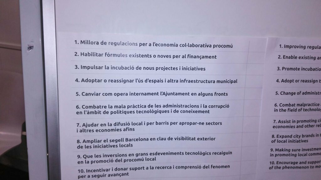 Pla estratègic de Mercats de Barcelona 2015-2025Promoure l'economia col·laborativa procomúFer de Barcelona una ciutat amb fiscalitat progressiva i lliure de frau fiscalRendes municipals infantil i complementàriaEducació comunitària i treball educatiu en xarxa als barrisFormació i acompanyament per avançar cap a una nova pràctica socioeconòmicaAutoritat municipal certificadora pel segell de qualitat i de bones pràctiquesCodi ètic per a càrrecs electes i personal directiuDesenvolupar el Comuns UrbansImpuls de projectes com l'Urban Lab i els ateneus de fabricació, vinculant-los a les polítiques de desenvolupament local i potenciant una xarxa d'equipaments d'innovació social digital de la ciutatImpulsar el sistema de finances ètiques i solidàriesFomentar la intercooperació empresarial, social i comunitàriaContractació socioambientalment responsable i transparentResidu zeroImpulsar el coneixement obert i les dades obertesAccions de col·laboració internacional que afavoreixin la circulació de creadors, produccions, idees i debats públicsFer un registre obligatori de reunions i contactes amb lobbiesSituar l'ocupació al centre de les polítiques municipalsPromoure l'ús de programari lliure en la gestió municipalImpulsar l'ECSS com a motor de desenvolupament territorial integratPla d'actuació per l'accés de les petites i mitjanes empreses (PIME) i l'ECSS a la contractació pública municipalActa de la trobada