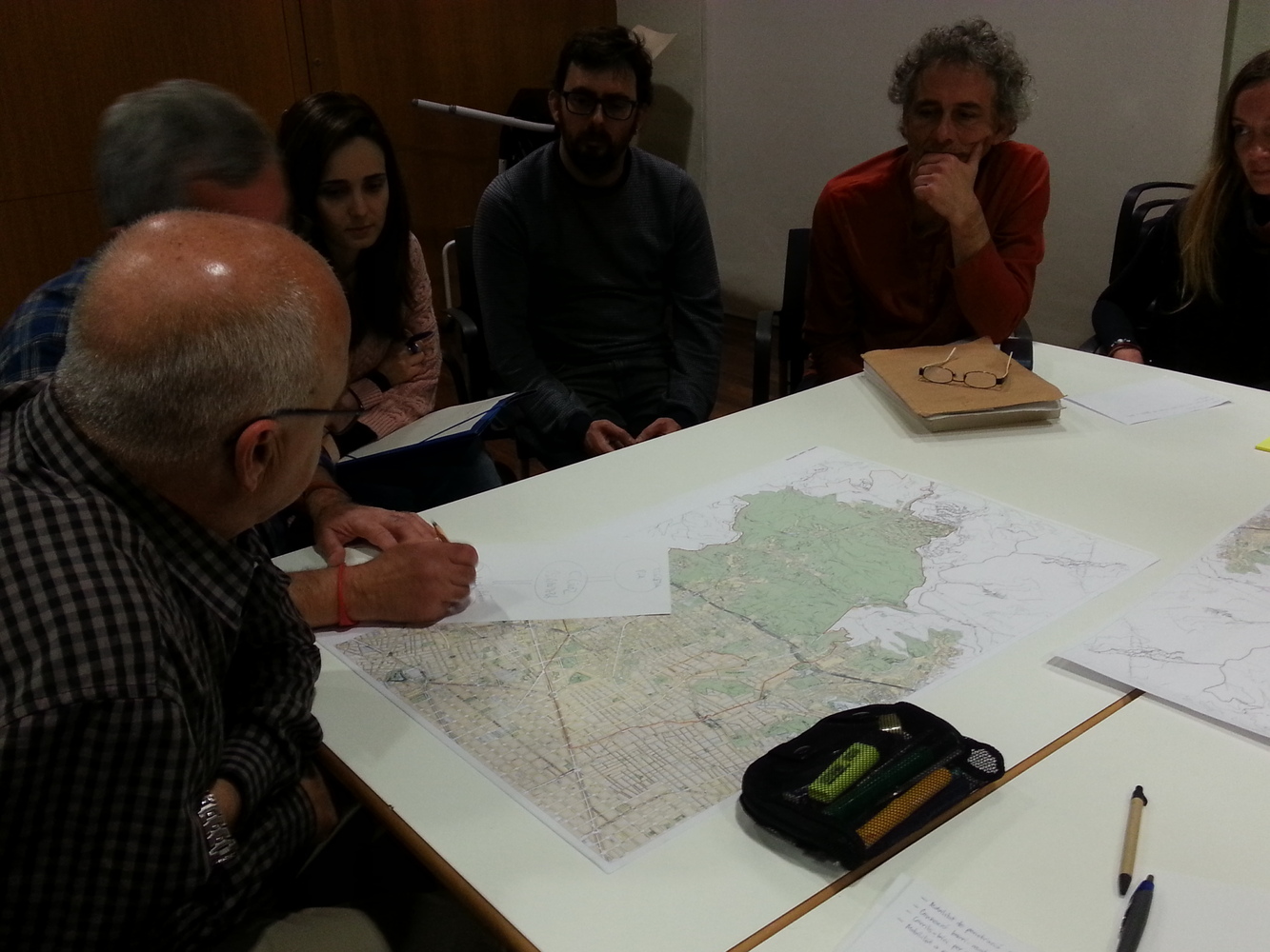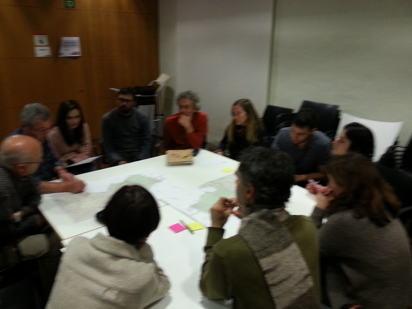 Durant el transcurs del treball en grup posterior, que inicialment estava previst per fer en dos grups, però que finalment es treballa en un, es van treballar dues parts: una primera diagnosi de les necessitats del barri i a continuació, propostes concretes d’actuació per a les temàtiques de les Superilles.